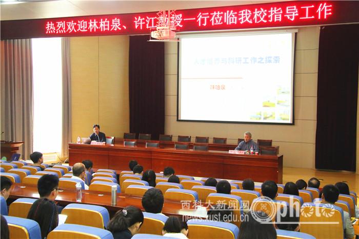 5月8日下午,中国矿业大学林柏泉教授和重庆大学许江教授应安全学院邀请做客ac米兰“胡杨林大讲堂”,两位教授在雁塔校区主楼报告厅分别作了题为《人才培养与科研工作之探索》和《基于综合作用假说的多功能煤矿瓦斯动力致灾物理模拟试验系统》的学术报告,报告会由学院常务副院长邓军教授主持,学校部分教师及研究生百余人聆听了报告。