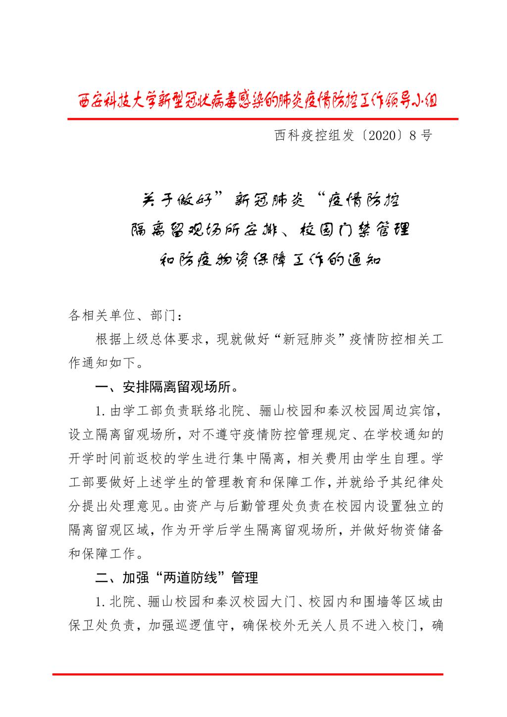 关于做好”新冠肺炎“疫情防控隔离留观场所、校园门禁和防疫物资保障工作的通知(西科疫控组8号)