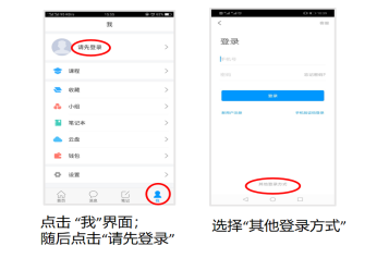 打开安装好的学习通App,可以看到如下图左的应用首页,点击右下角的“我的”,进入如下中图的界面,点击上方灰色头像,选择下方“其他登陆方式”输入统一身份认证账号及密码登陆即可。